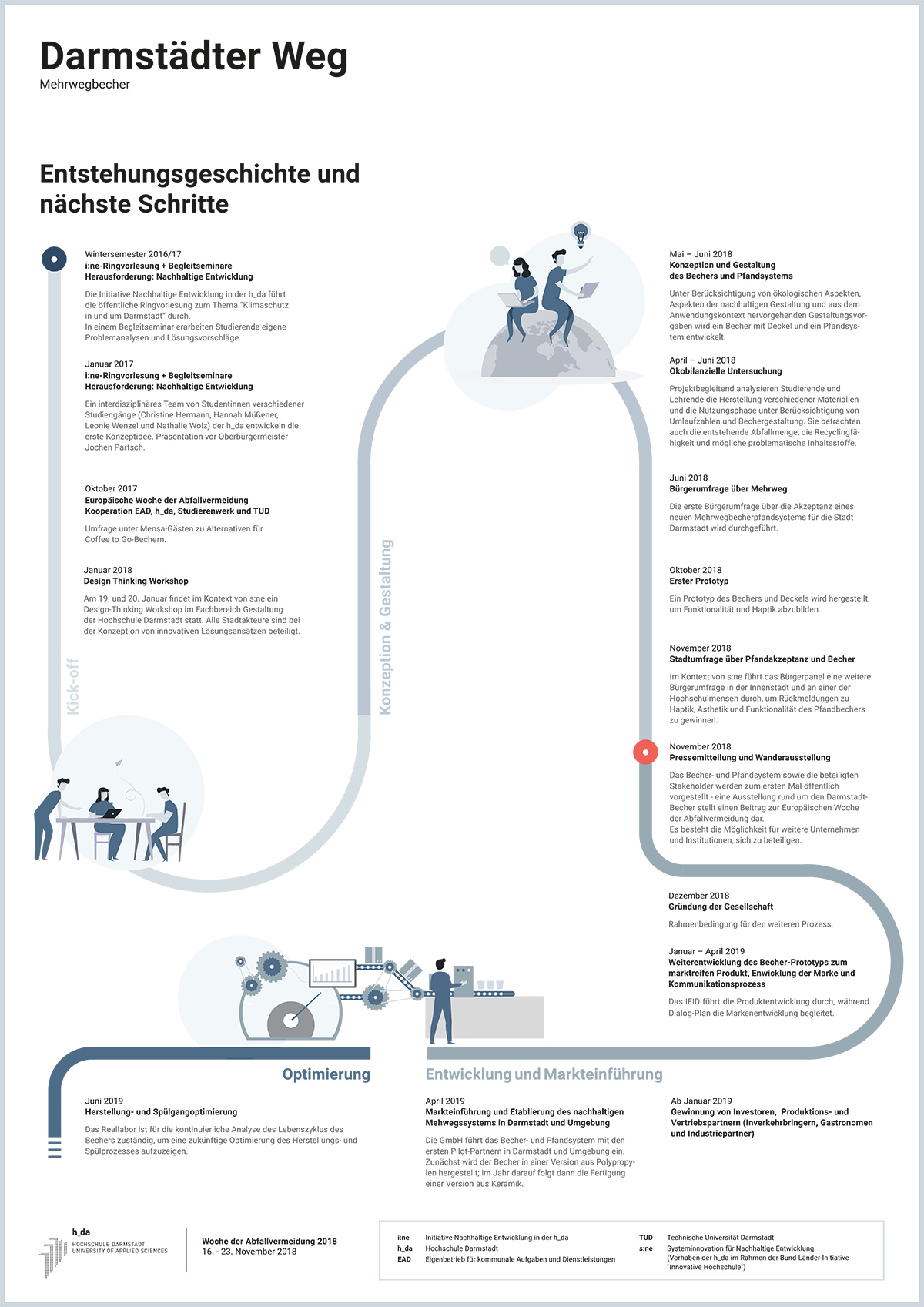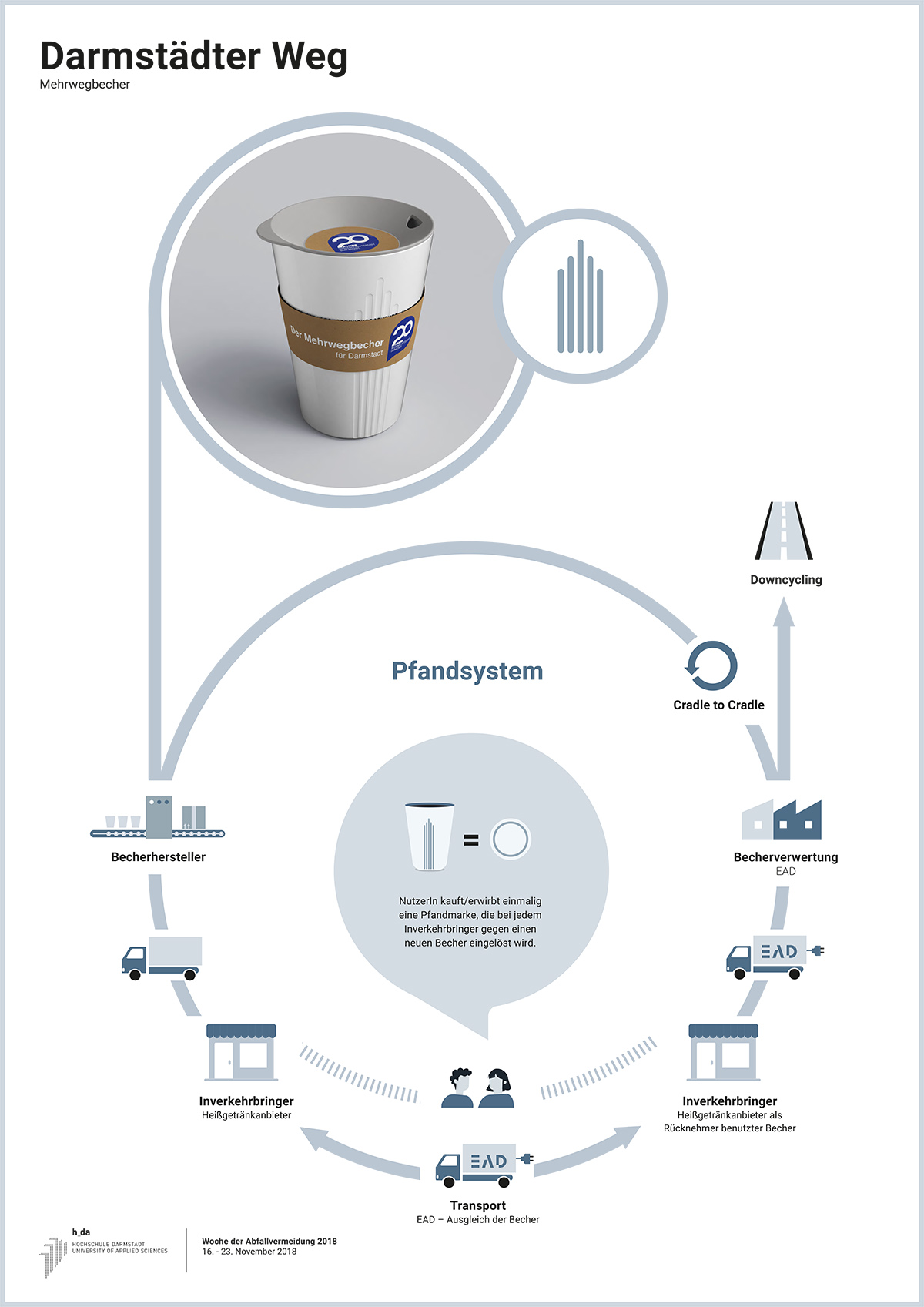 Daran wollten Studentinnen der Hochschule Darmstadt (h_da) etwas ändern und präsentierten Oberbürgermeister Jochen Partsch vor gut zwei Jahren in der Ringvorlesung der „Initiative: Nachhaltige Entwicklung“ (i:ne) ihre Vision einer Mehrwegbecher-Lösung für Darmstadt. Hieraus entwickelte sich ein Kooperationsprojekt von h_da und Stadt Darmstadt, an dem neben dem Umweltamt unter anderem die HEAG, der EAD, „e-hoch-3“ sowie das Studierendenwerk beteiligt sind.
