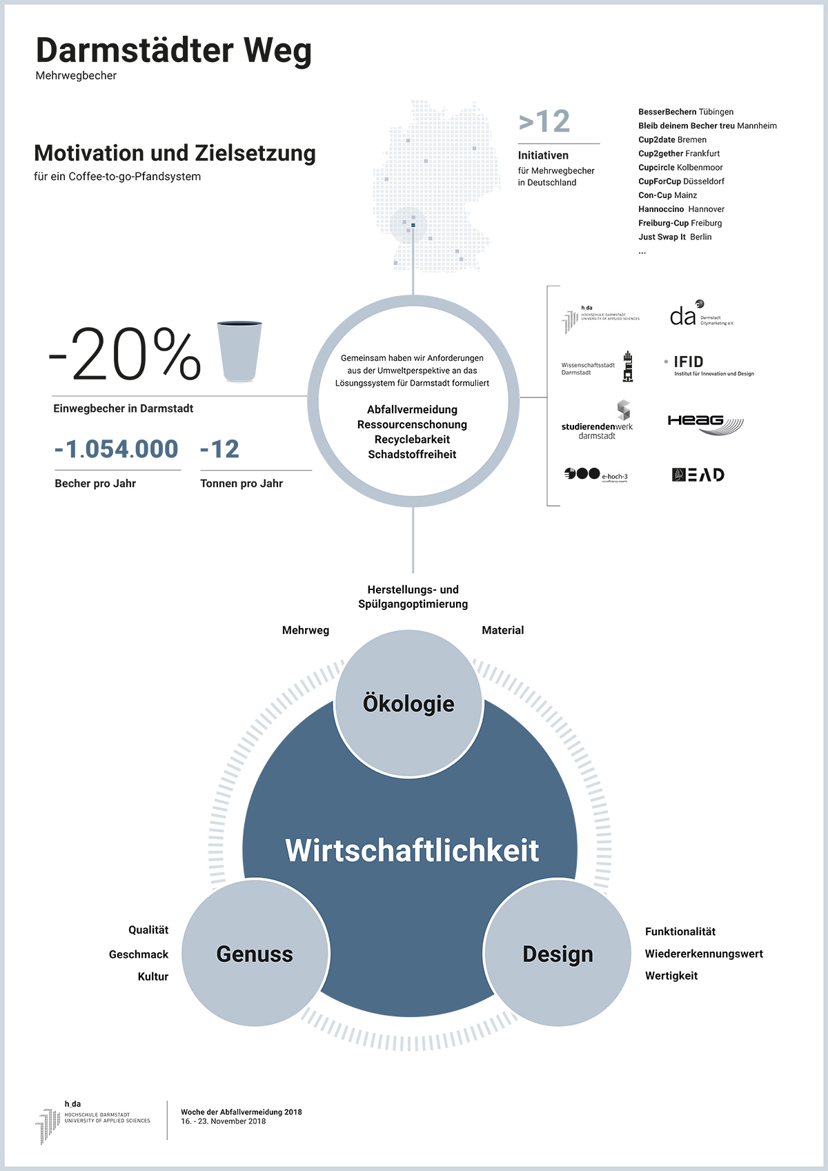 Das Darmstädter Mehrweg-System soll einerseits unter ökologischen Gesichtspunkten überzeugen, über das Design des Bechers aber auch Genuss und Emotion ansprechen. Mit Blick auf die Ökologie sind mindestens 20 Prozent weniger Einwegbecher in Darmstadt das gesteckte Ziel. Das entspräche über 1 Mio. Becher bzw. 12 Tonnen weniger Müll pro Jahr. Somit würde der Mehrwegbecher zu Abfallvermeidung und Ressourcenschonung beitragen.